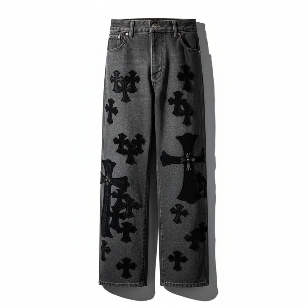 The Chrome Hearts Pants are luxury gray streetwear with a bold design and premium craftsmanship. Tailored from high-quality materials, these pants feature a structured yet relaxed fit that embodies the brand's distinctive attitude. The neutral gray tone gives them a versatile edge, while signature Chrome Hearts cross patches and gothic hardware complete the look with refined detail.